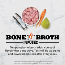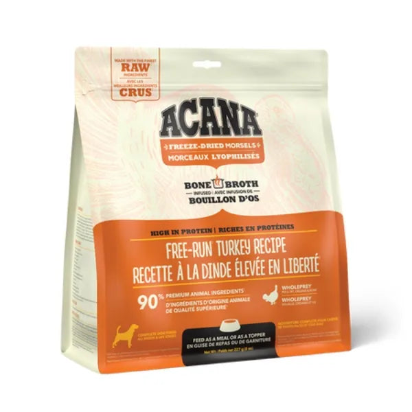 Acana Bone Broth Infused Freeze-Dried Morsels for Dogs - Free-Run Turkey Recipe features 83% free-range turkey including the organs and bone, 10% fresh Mackeral with 7% fruits and vegetables such as pumpkin and cranberries with chicken bone broth. This recipe also includes essential antioxidants, vitamins and minerals such as Niacin, fibre, vitamin E, zinc and more. To give your dog a nutritional freeze-dried that can be a complete meal or added to your dog's current food as a food topper.