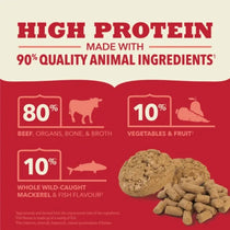 Acana Bone Broth Infused Freeze-Dried Morsels - Ranch Raised Beef, features 80% ranch-raised beef including the organs and bone, 10% fresh Mackeral with 10% fruits and vegetables such as pumpkin and cranberries with beef bone broth. This recipe also includes essential antioxidants, vitamins and minerals such as Niacin, fibre, vitamin E, zinc and more. To give your dog a nutritional freeze-dried that can be a complete meal or added to your dog's current food as a food topper.