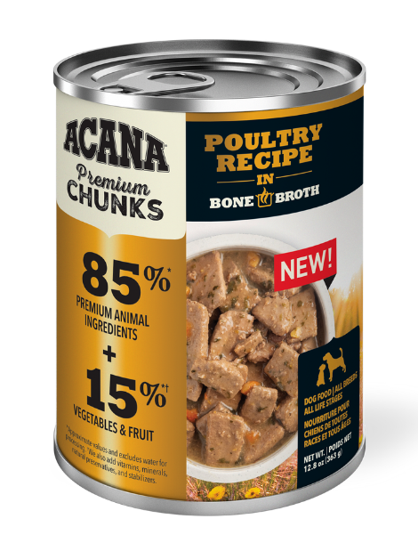 Every can of ACANA® Premium Chunks is crafted thoughtfully from start to finish. Our Poultry Recipe in Bone Broth is crafted with 85%* animal ingredients including premium chunks of poultry, balanced with 15%*† visible fruit and vegetables, all in a savory bone broth base. Add it as a topper on your dog’s favorite ACANA kibble to provide them with more hydration and crave-worthy flavor, or feed alone for an indulgent treat at mealtime.