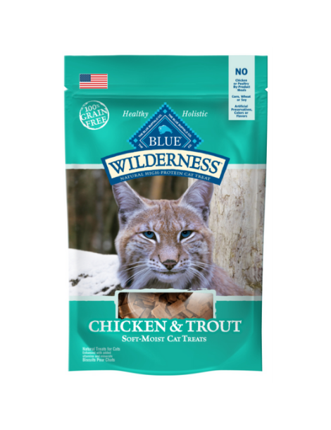 BLUE Wilderness Chicken & Trout soft-moist cat treats are the perfect way to cater to your feline's inner carnivore. Loaded with real chicken and trout, these soft-moist cat treats have the flavor your cat craves. BLUE Wilderness cat treats are 100% grain-free and are free from chicken or poultry by-product meals and artificial flavors & preservatives. Made with the finest natural ingredients, BLUE Wilderness cat treats are the perfect way to reward your four-legged friend.