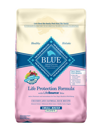 BLUE Life Protection Formula Chicken and Oatmeal Recipe for Small Breed Puppies is made with only the finest natural ingredients, featuring ingredients that support healthy growth and development. Made with delicious, protein-rich, deboned chicken and wholesome whole grains, garden veggies and fruit, BLUE Life Protection Formula contains NO chicken (or poultry) by-products, NO corn, wheat or soy and NO artificial colors, flavors or preservatives.