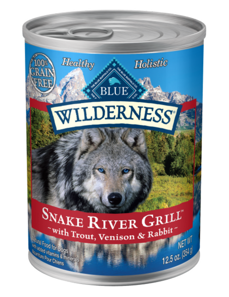 Wolves have hunted along America's Snake River for centuries, inspiring the scrumptious, meat-rich blend of trout, venison and rabbit featured in BLUE Wilderness Snake River Grill wet food. Made from the finest natural ingredients enhanced with vitamins and minerals, Snake River Grill satisfies your dog's inner wolf with more of the high-protein foods he was born to love - with no chicken (or poultry) by-product meals, artificial preservatives, corn, wheat or soy. It's a sensible alternative to less convenient raw diets, which often require extra supplementation to be nutritionally complete.