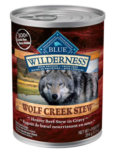 Inspired by Western-style campfire cooking, BLUE Wilderness Wolf Creek Stew is a hearty dinner that captures the spirit of the open prairies where wolves roamed freely. A hearty, grain-free recipe with generous chunks of beef, Wolf Creek Hearty Beef Stew is made with the meat your dog craves and is steeped in a savory gravy for an irresistible flavor. Fortified with vitamins and minerals, it contains only the finest ingredients with no chicken (or poultry) by-product meals, no corn, wheat, or soy. In addition, Wolf Creek is made without artificial preservatives, colors or flavors.