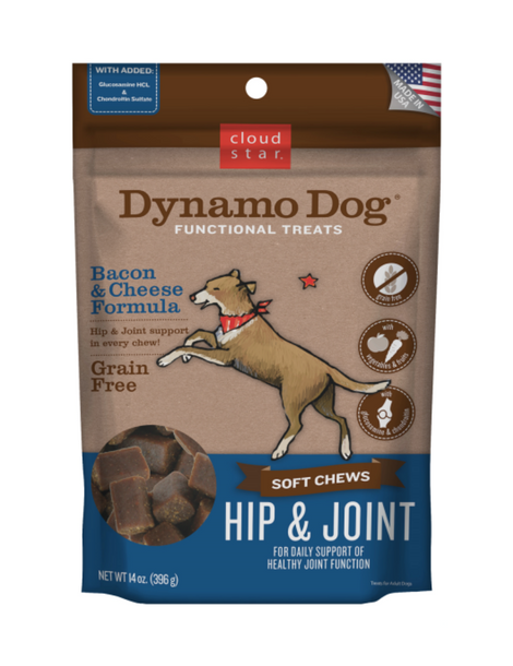 Dogs, like people, benefit from daily vitamins. That's why Cloudstar developed their Dynamo Dog Functional Soft Chews. Now, there is a fun and delicious way to help support your dog's specific needs. If your active or senior dog needs an extra glucosamine and chondroitin boost, try these bacon & cheese treats. They contain glucosamine, chondroitin and New Zealand green mussel to help promote healthy hips and joints. These soft-textured treats contain a daily measured dose of supplementation for your dog's weight. They contain no grain, gluten, corn or soy.