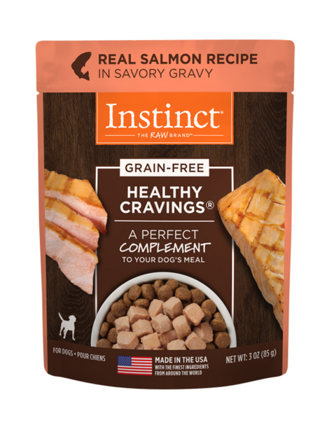 Add the taste and variety your dog craves with Instinct Healthy Cravings Grain-Free Real Salmon Recipe - the perfect complement to your dog's meal. With cuts of wild-caught salmon in a savory gravy, it's made without grain, potato, corn, wheat, soy, by-product meal, artificial colors or preservatives. Use as a topper or mixer to add the delicious taste and moisture your dog craves.