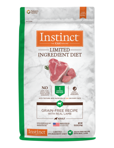 When your dog has food sensitivities, knowing exactly what's in their food is important. Instinct LID Grain Free Recipe with Real Lamb is made with one animal protein and one vegetable. Grass-fed lamb is a nutrient rich, easily digestible protein that provides all the essential amino acids. Natural Omegas and antioxidants support healthy skin & coat and immune system. With pure, real raw nutrition on every piece, Instinct LID Grain Free contains no grain, dairy, eggs, chicken, beef, fish, sweet potato, potato, chickpeas, corn, wheat, soy, artificial colors or preservatives.