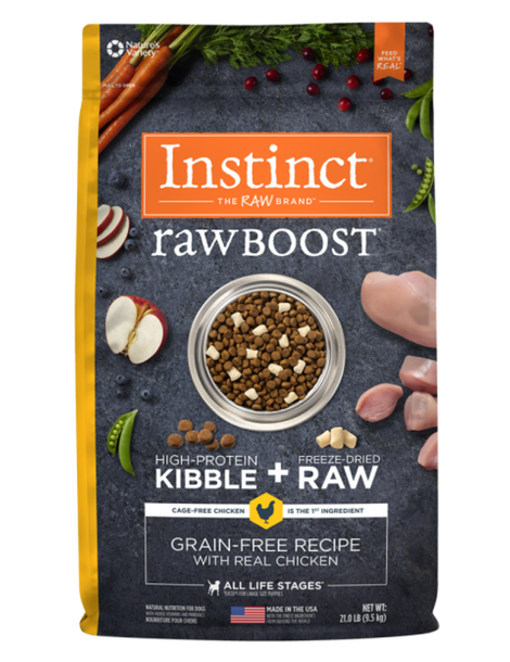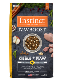 With high animal protein, grain-free, boosted nutrition with bites of freeze-dried raw meat, Instinct Raw Boost Grain-Free Recipe with Real Duck is a better way feed kibble. Unlock your dog's potential to thrive & put more of the pure, real nutrition of raw into every bowl. With cage-free duck as the first ingredient, it's packed with animal protein for strong, lean muscles. Probiotic boost, higher Omegas & more antioxidants provide digestive health, healthy skin & coat and immune health. It contains no grain, potato, corn, wheat, soy, by-product meal, artificial colors or preservatives.