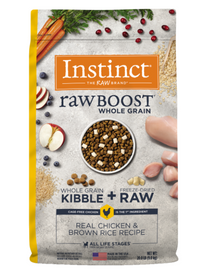 Protein packed, nutrient-rich food with bites of freeze-dried raw meat, Instinct Raw Boost Whole Grain Real Chicken & Brown Rice Recipe is a better way to feed kibble. Cage-free chicken is the first ingredient ensuring its packed with animal protein for strong, lean muscles. Whole grains provide beneficial fiber for digestive health. Made in the USA without corn, wheat, soy, potato, peas, lentils, by-product meal, artificial colors or preservatives. Unlock your dog's potential to thrive and put more of the pure, real nutrition of raw into every bowl.