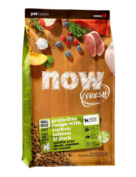 NOW FRESH™ Small Breed Recipe is made with 100% FRESH turkey, salmon, duck, and 100% fresh Omega 3 & 6 oils from coconuts and canola. NOW FRESH™ also features zero grains, gluten, wheat, beef, corn or soy. Zero rendered meats, by-products or artificial preservatives.