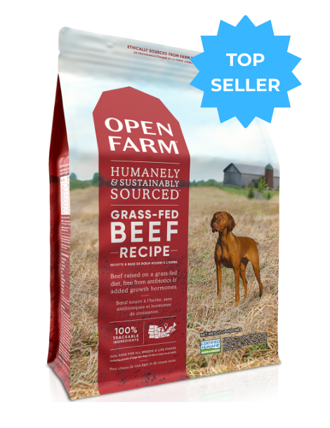 Open Farm Grass-Fed Beef for dogs is made with certified humane beef raised free from antibiotics or added growth hormones. High in protein and fresh beef, Open Farm Grass-Fed Beef recipe is a source of prebiotic fibers to support healthy digestion. With no rendered poultry or meat meals, it's made with nutrient-rich superfoods like coconut oil and non-GMO fruits & vegetables like apple and pumpkin. Made with no artificial flavors, colors or preservatives, this recipe contains no grain, corn, wheat or soy.