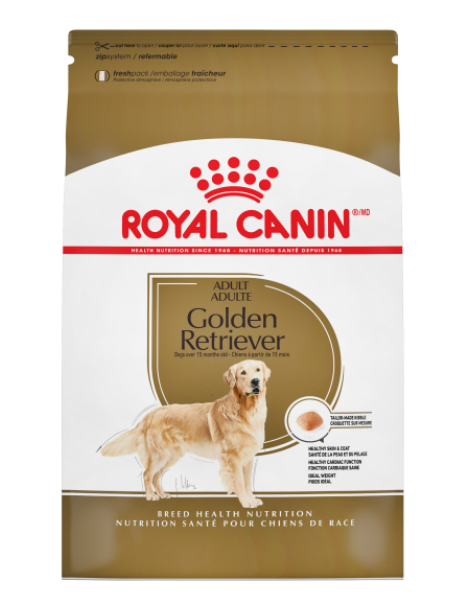 Royal Canin Golden Retriever Adult is for Golden Retrievers over 15 months old. Targeted nutrients help promote an ideal body condition and strengthen skin, while providing a strong, glossy coat. Tailor-made for their unique jaw, the ciabatta-bun shaped kibble's size and texture promote grasping and chewing one kibble at a time. Nutritional support aids in appetite control and promotes fat burning and lean muscle mass. Taurine, Omega 3s (EPA and DHA), L-carnitine and Antioxidants support the health and proper functioning of the heart, providing your Golden Retriever with tailor-made nutrition.