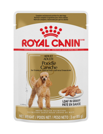 Royal Canin Poodle Loaf in Gravy Pouch provides complete and balanced nutrition for adult Poodles over 10 months old. It contains omega-6 and omega-3 fatty acids, including EPA and DHA, and a combination of B vitamins and amino acids to nourish the Poodle's skin and coat. It supports the specific needs of adult Poodles is formulated with high protein and L-carnitine to help maintain muscle mass.